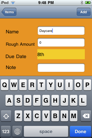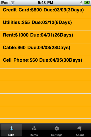 By default, the App manage bills for rent, utilities, cable, cell phone, credit card, it also setup default payment amount and due date for demonstration purpose . You can easily add other bill items or modify the amount and due day of the existed ones to make them fit your needs.