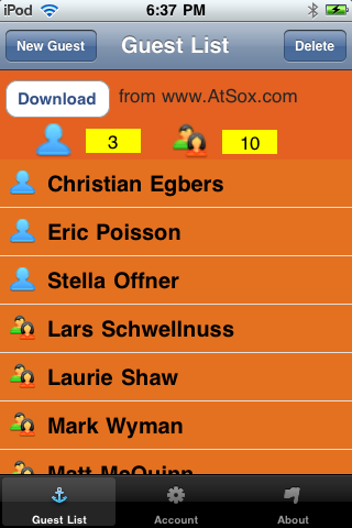 You can use the App to download the guest list from its free online version at www.AtSox.com. You need to sign up at the website (it is free) and tell the App your account information at www.AtSox.com. After that, it would be very convenient for you to manage your list online with your desktop (so you can copy/paste or print), and download it to your IPhone through the App by one single click.