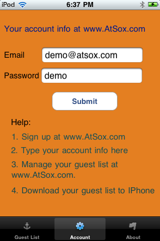 By default, the App was set up with a demo account at www.AtSox.com. You can use the demo account to familiarize yourself how it works. After that, you would need to have your own account in order to manage your personal list.